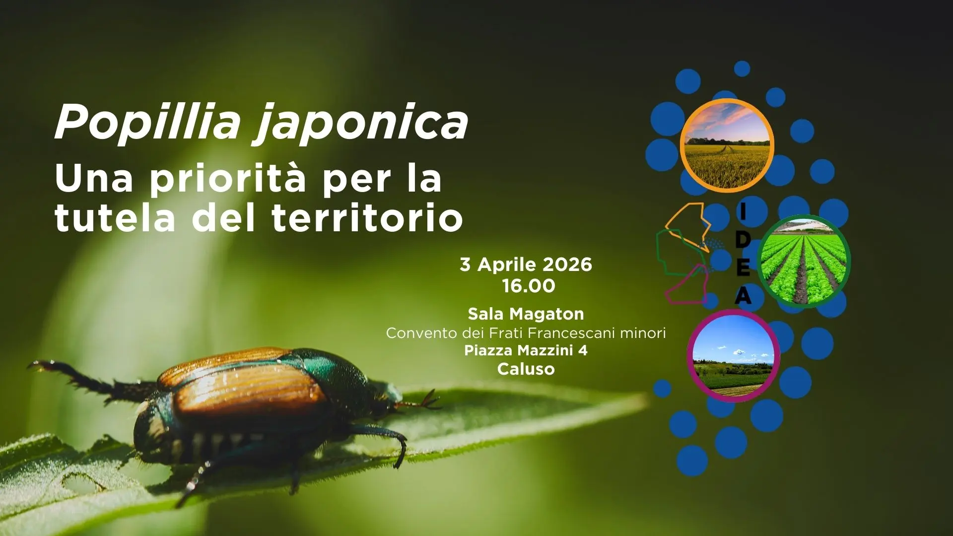 Per approfondire rischi, dinamiche di espansione e strumenti oggi disponibili per il suo contenimento, il progetto IDEA organizza un incontro pubblico dal titolo Popillia Japonica. Una priorità per la tutela del territorio. Conoscere, monitorare e gestire un insetto invasivo, grazie al contributo del Prof. Alberto Alma, dell’Università di Torino (Dipartimento di Scienze Agrarie, Forestali e Alimentari).